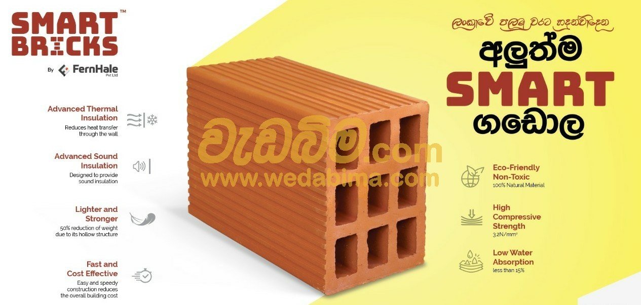 FernHale (Pvt) Ltd was established with the vision of introducing sustainable/ eco-friendly products in Sri Lanka. Our first product to reach the market is Smart Bricks, a clay hollow brick made with 100% natural resources. This is the first of our sustainable products with many more in the pipeline.Smart Bricks are innovative clay hollow bricks, encompassing the reassuringly traditional value of clay material while delivering sustainable, resourceful solutions to walling systems. The unique design of these bricks being perforated horizontally makes them considerably lighter compared to other bricks of similar size. They also provide improved acoustic and maximum thermal insulation.Although a new concept in Sri Lanka, clay hollow bricks have been in use by the construction industry in Southern India and the Mediterranean region for over a decade.As clay retains its inherent strength and durability, it has made clay the building material of choice over centuries. Clay bricks and roofing tiles signify particularly green building materials consisting of natural raw materials of clay and water.Clay is a material that can be used in order to reduce the carbon footprint; it is produced locally, ideally suits the local climate and does not contain harmful chemicals. Since it is sourced from the earth, it can be re-used or returned to the soil when the building is no longer in use. These are just a few of the many reasons why our clay products constitute an essential part of FernHale (Pvt) Ltd’s, sustainable building concepts. We guarantee a high quality of living with a luxurious appearance to your interiors and give you an opportunity of using sustainable, eco-friendly products in your constructions. In our aim to provide you with a superior product, we have completed testing by SLS (Sri Lanka Standards) Institute and NBRO (National Building Research Organization) to suit numerous specifications. we are provide 8 inch smart brick (12x8x6), 6 inch smart brick (12x6x8), smart brick (6x8x6), 6 inch lintel smart brick (12x8x6), ventilation brick (3x8x6), sliced clay brick for facades (20cmx6cmx2cm), Calicut tile, roman tile, flat tile, ridge tile, sunk box brick and planting brick .